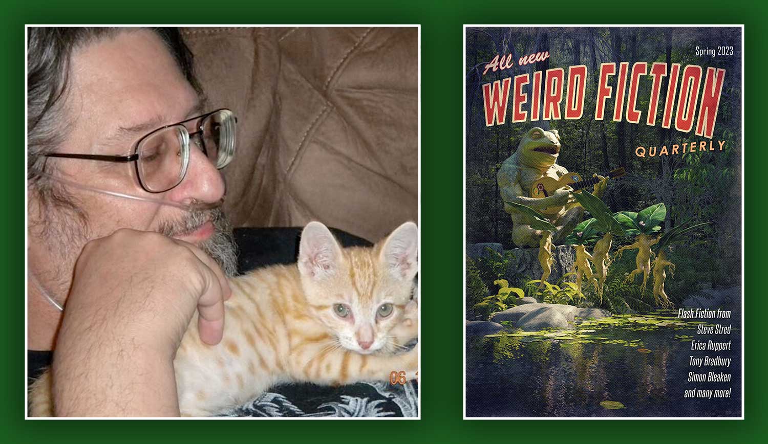 He lives in southern Arizona with his guitars, books, and cats.
