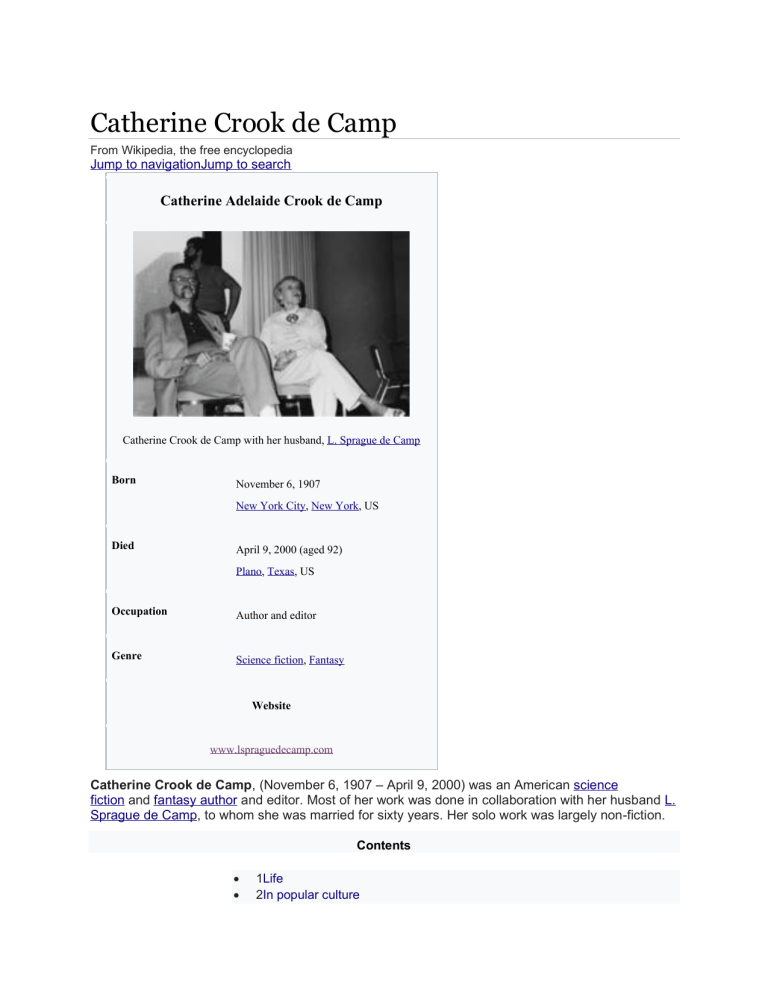 Catherine Crook de Camp, (November 6, 1907, New York City – April 9, 2000, Plano, Texas) was an American science fiction and fantasy author and editor. Most of her work was done in collaboration with her husband L. Sprague de Camp, to whom she was married for sixty years. Her solo work was largely non-fiction.