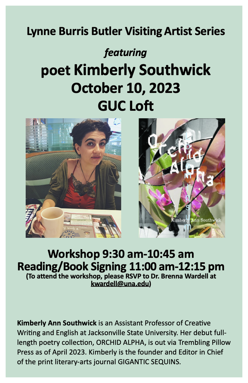 Kimberly Ann Southwick is the founder and editor in chief of the biannual print literary arts journal Gigantic Sequins. She has two poetry chapbooks, every song by Patsy Cline (dancing girl press, February 2014) and efs & vees (Hyacinth Girl Press, 2015). She is an Assistant Professor of Poetry and Literature at Jacksonville State University in Alabama, and her debut poetry collection, ORCHID ALPHA, came out in 2023.