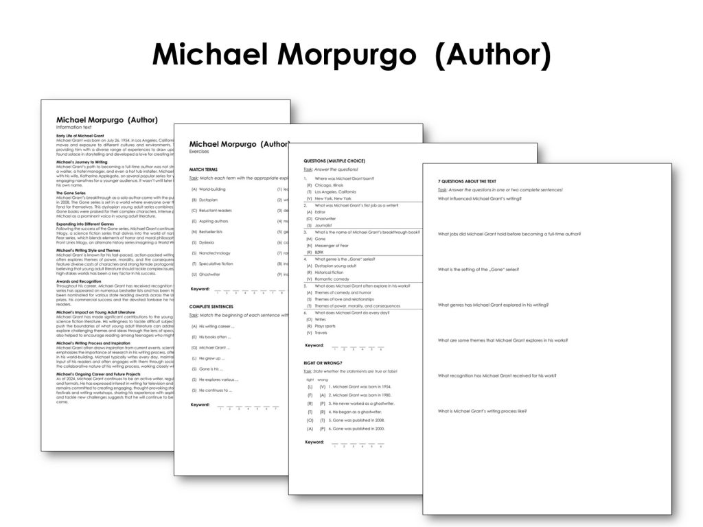 Sir Michael Andrew Morpurgo, OBE, FRSL is the author of many books for children, five of which have been made into films. He also writes his own screenplays and libretti for opera. Born in St Albans, Hertfordshire, in 1943, he was evacuated to Cumberland during the last years of the Second World War, then returned to London, moving later to Essex. After a brief and unsuccessful spell in the army, he took up teaching and started to write. He left teaching after ten years in order to set up 'Farms for City Children' with his wife. They have three farms in Devon, Wales and Gloucestershire, open to inner city school children who come to stay and work with the animals. In 1999 this work was publicly recognised when he and his wife were invested a Member of the Order of the British Empire (MBE) for services to youth. In 2003, he was advanced to an Officer of the Order of the British Empire (OBE). He became a Fellow of the Royal Society of Literature (FRSL) in 2004. He was knighted in the 2018 for his services to literature and charity. He is also a father and grandfather, so children have always played a large part in his life. Every year he and his family spend time in the Scilly Isles, the setting for three of his books.